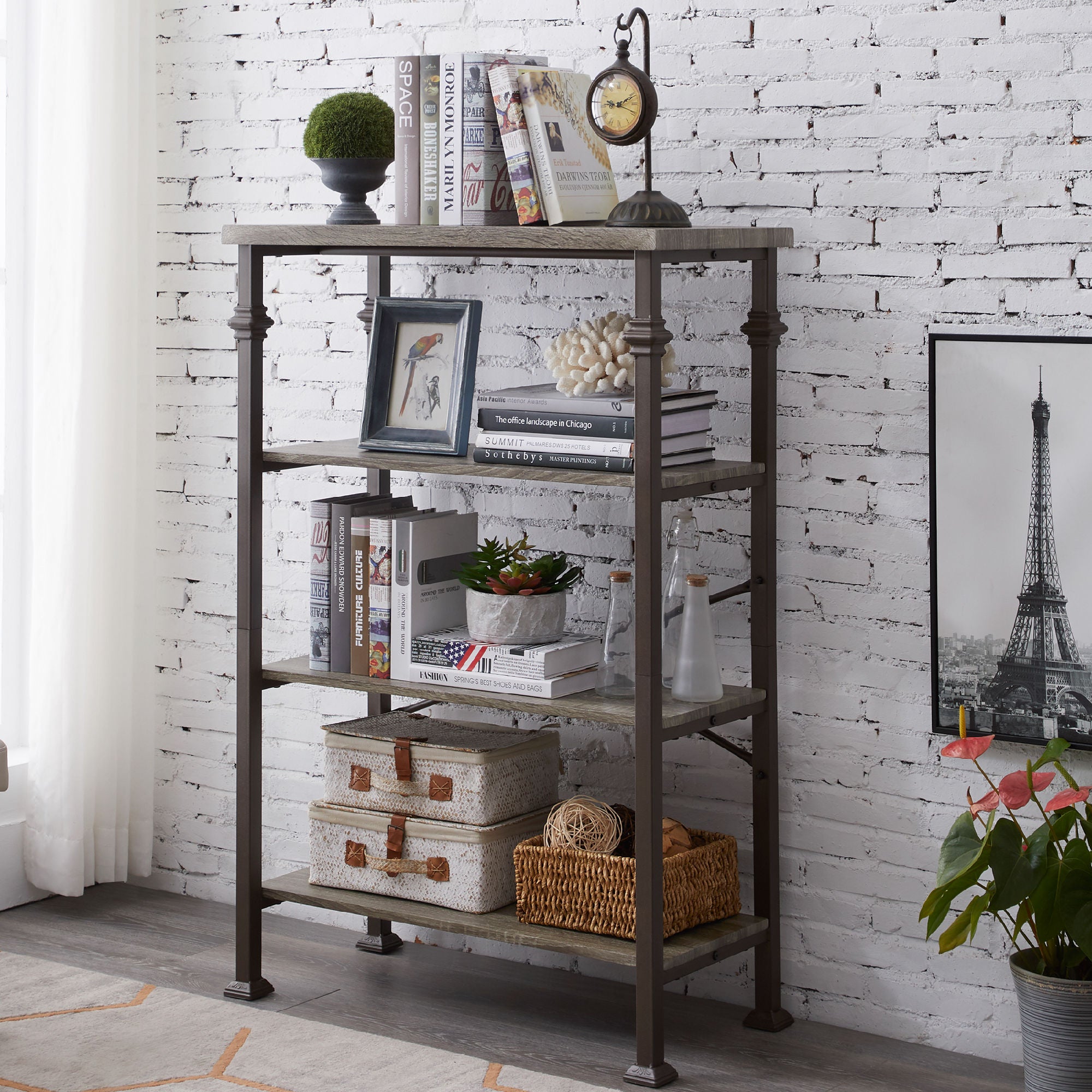 Free shipping 4-Tier Bookshelf, Rustic Industrial Style Bookcase Furniture, Free Standing Storage Shelves for Living Room Bedroom and Kitchen, Grey Oak